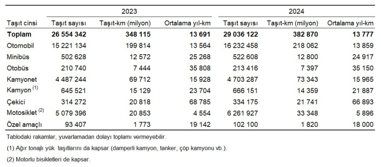 Taşıtların yıllık ortalama yaptığı kilometrelerine nazaran ise; çekiciler 66 bin 893 km, otobüsler 35 bin 150 km, minibüsler 24 bin 917 km, kamyonlar 21 bin 887 km, özel gayeli taşıtlar 18 bin km, kamyonetler 15 bin 965 km, arabalar 13 bin 859 km, motosikletler 5 bin 896 km oldu.