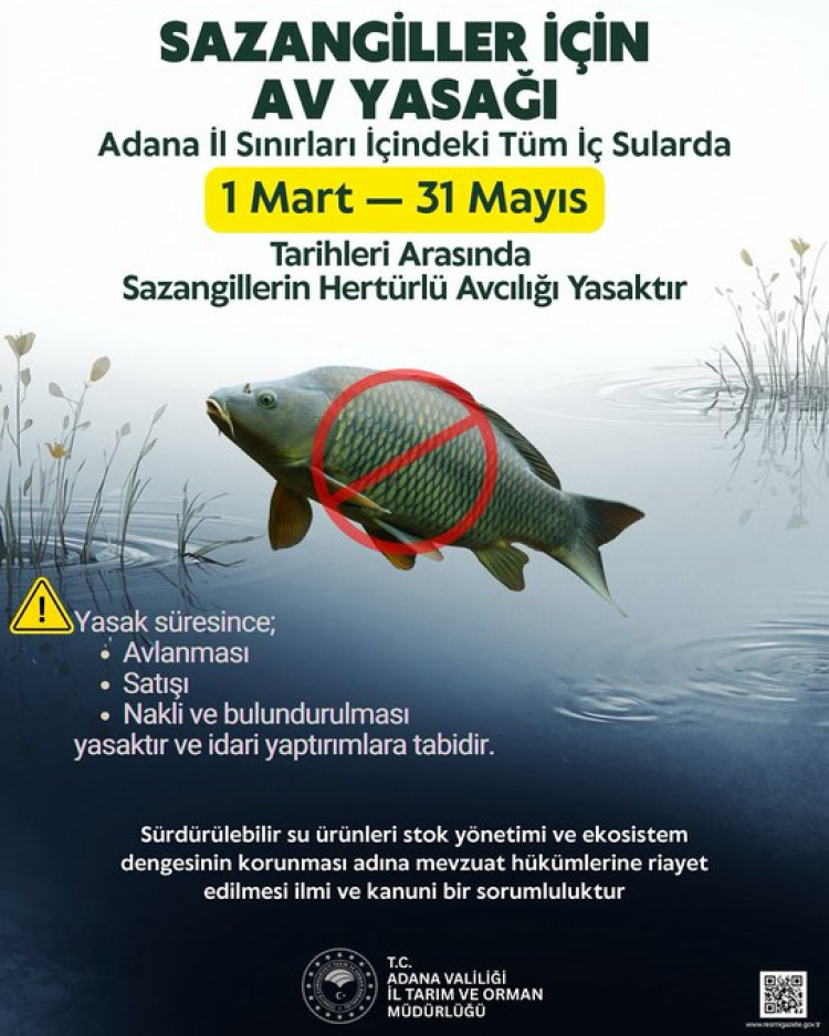 Adana İl Tarım ve Orman Müdürlüğü, 1 Mart – 31 Mayıs tarihleri arasında iç sularda sazangillerin avlanmasının yasak olduğunu duyurdu. Yasak kapsamında avlanma, satış, nakil ve bulundurma fiilleri idari yaptırıma tabi olacak.