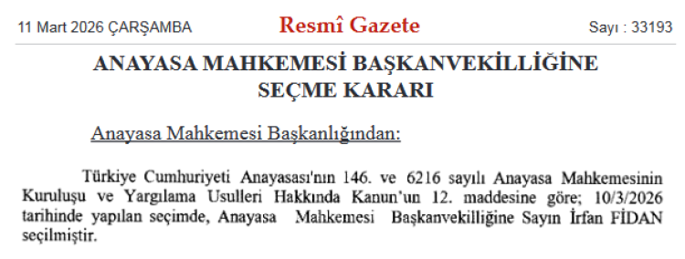 ANKARA (İGFA) – Anayasa Mahkemesi Başkanvekilliği’ne İrfan Fidan’ın seçilmesine ilişkin karar, bugünkü Resmi Gazete’de yayımlandı.