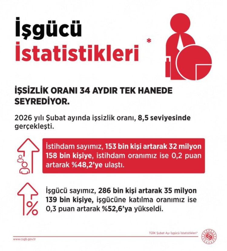 Bakan Işıkhan’a göre, 2026 yılı Şubat ayında işsizlik oranı yüzde 8,5 seviyesinde gerçekleşti. Bu, Türkiye’nin istihdam alanında önemli bir başarı olarak görülüyor.
