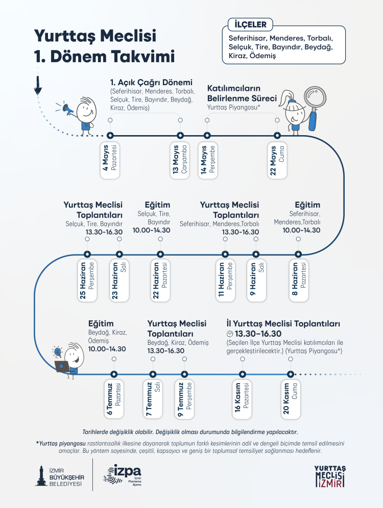 Seferihisar, Menderes, Torbalı, Selçuk, Tire, Bayındır, Beydağ, Kiraz ve Ödemiş’te yaşayan vatandaşlar Yurttaş Meclisi’nin bir parçası olmak için başvurularını 4-13 Mayıs 2026 tarihleri arasında yapabilecek. Başvuru için 18 yaşını doldurmuş olma ve ilgili ilçede en az 5 aydır ikamet etme şartı aranacak. Katılımcılar demografik denge gözetilerek “Yurttaş Piyangosu” yöntemiyle belirlenecek.