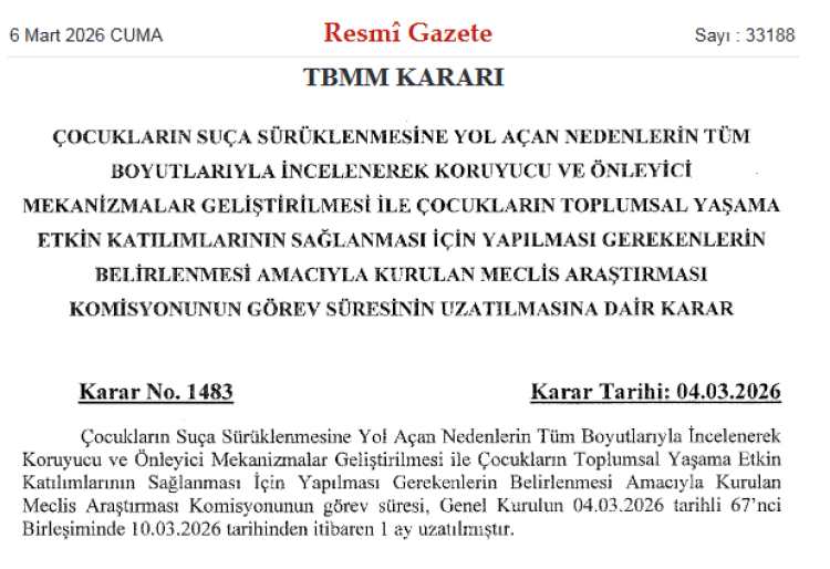 İlgili karara göre, “Çocukların Suça Sürüklenmesine Yol Açan Nedenlerin Tüm Boyutlarıyla İncelenerek Koruyucu ve Önleyici Mekanizmalar Geliştirilmesi ile Çocukların Toplumsal Yaşama Etkin Katılımlarının Sağlanması İçin Yapılması Gerekenlerin Belirlenmesi Amacıyla Kurulan Meclis Araştırması Komisyonu”nun görev süresi bir ay daha uzatıldı.