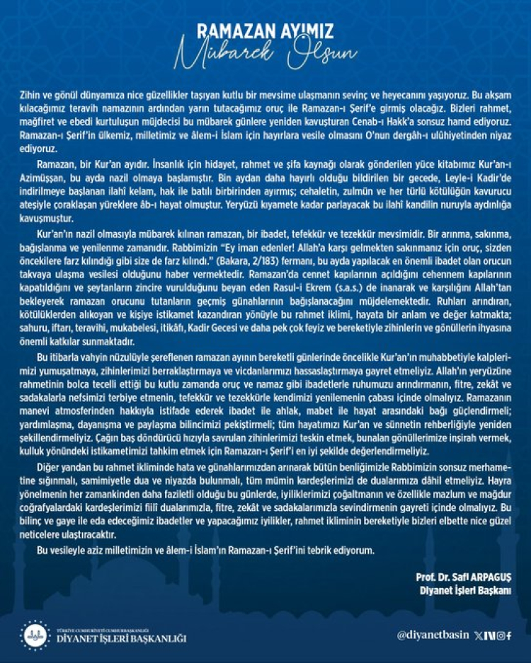 Diyanet İşleri Başkanı Prof. Dr. Safi Arpaguş, Ramazan ayının ruhuna dikkat çekerek, ibadet, yardımlaşma ve manevi arınma çağrısında bulundu.