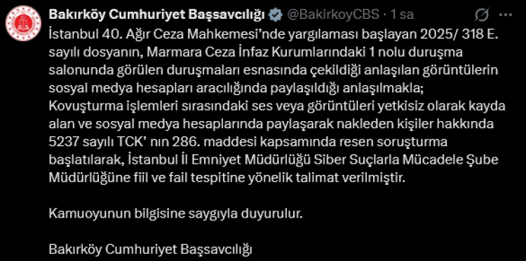 Yetkisiz kişiler tarafından kaydedilen ve sosyal medyada yayınlanan içeriklerle ilgili olarak re’sen soruşturma başlatıldığı ve İstanbul İl Emniyet Müdürlüğü Siber Suçlarla Mücadele Şube Müdürlüğü’ne fiil ve fail tespitine yönelik talimat verildiği ifade edildi. Açıklamada duruşma ve kovuşturma süreçlerinde gizlilik ve güvenliğin önemine dikkat çekildi.