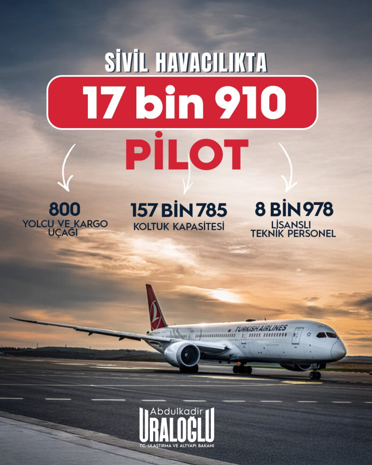 ANKARA (İGFA) – Ulaştırma ve Altyapı Bakanı Abdulkadir Uraloğlu, Türkiye’nin havacılık sektöründeki son verilerini paylaştı. Bakan, 2025 yılı itibarıyla pilot sayısını 17 bin 910’a, teknik personel sayısını ise 8 bin 978’e çıkararak nitelikli insan kaynağını güçlendirdiklerini açıkladı.