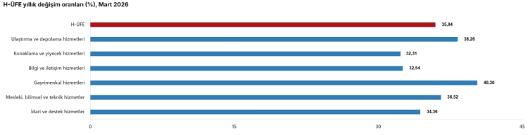 Yıllık bazda en dikkat çekici artışlardan biri yüzde 40,30 ile gayrimenkul hizmetlerinde gerçekleşti. Ulaştırma ve depolama hizmetlerinde yüzde 38,26, mesleki, bilimsel ve teknik hizmetlerde yüzde 36,52, idari ve destek hizmetlerde yüzde 34,36 artış yaşandı. Bilgi ve iletişim hizmetleri yüzde 32,54, konaklama ve yiyecek hizmetleri ise yüzde 32,31 oranında yükseldi.