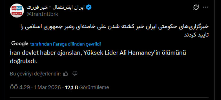 İran devlet televizyonu ve IRNA, Hamaney’in öldüğünü doğruladı ve 40 günlük ulusal yas ilan edildiğini duyurdu.