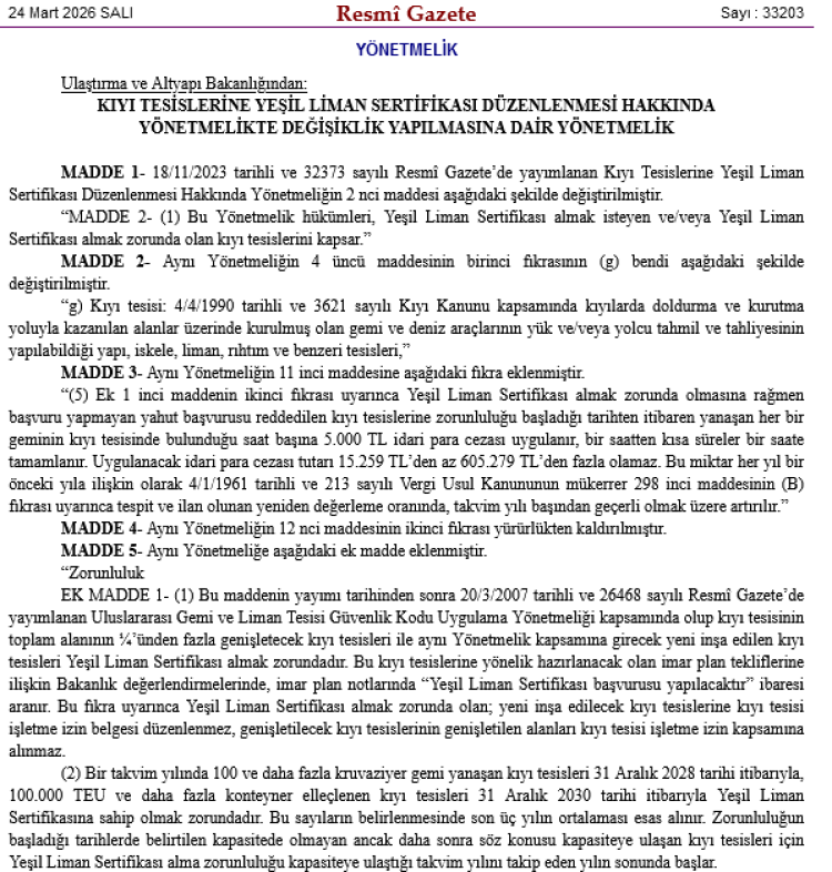 Bugünkü Resmi Gazete’de yayımlanan yeni düzenlemeyle, belirli kapasitenin üzerindeki limanlar için Yeşil Liman Sertifikası zorunlu hale getirildi. Başvuru yapmayan tesislere saat başı para cezası uygulanacak.