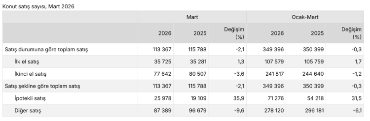 TÜİK verilerine göre Mart ayında ilk el konut satışları artarken ikinci el ve yabancılara satışlarda düşüş dikkat çekti. Mart ayı verileri hem konut, hem de iş yeri piyasasında kredi destekli satışların arttığını, buna karşın genel satışlarda ve özellikle ikinci el piyasasında zayıflamanın sürdüğünü ortaya koydu.