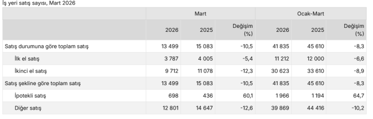 İş yeri satışlarında da benzer bir tablo ortaya çıktı. İlk el iş yeri satışları yüzde 5,4 azalarak 3 bin 787’ye, ikinci el satışlar ise yüzde 12,3 düşüşle 9 bin 712’ye geriledi. Buna karşın ipotekli iş yeri satışları yüzde 60,1 artarak 698’e yükselirken, diğer satışlar yüzde 12,6 azalarak 12 bin 801 oldu.