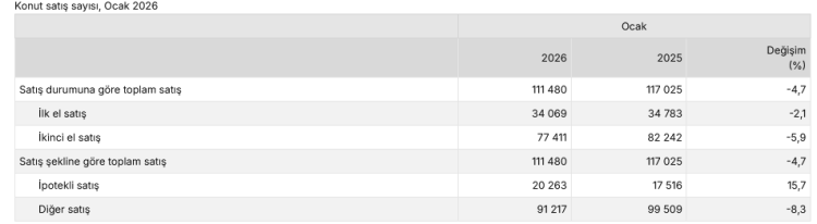 Türkiye İstatistik Kurumu (TÜİK) verilerine göre Ocak ayında ilk el ve ikinci el konut satışları gerilerken, ipotekli satışlarda dikkat çeken artış yaşandı. Yabancılara satışta ise sert düşüş kaydedildi.
