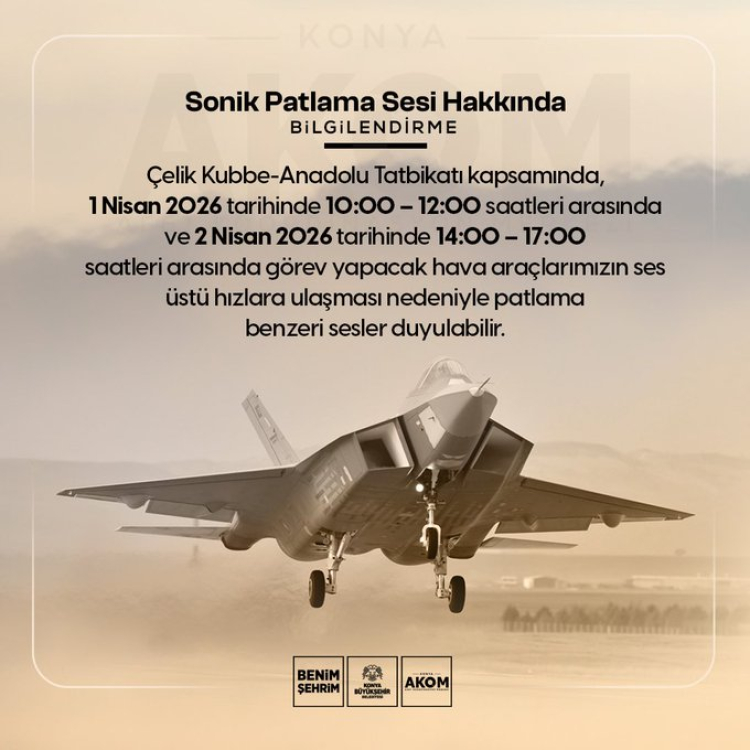 Konya AKOM, Çelik Kubbe-Anadolu Tatbikatı kapsamında 1 Nisan itibariyle belirli saatlerde ses üstü uçuşlar nedeniyle patlama benzeri sesler duyulabileceğini açıkladı.