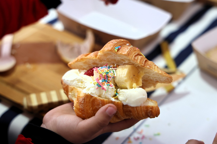 Atölyede minik katılımcılar, kruvasanlarını adeta küçük birer sanat eserine dönüştürüyor. Çikolata sosları, meyveler ve farklı süslemelerle hazırlanan ürünler, çocukların hayal gücünü yansıtan renkli tablolara dönüşüyor. Ortaya çıkan kruvasanlar sadece süslenmekle kalmıyor; çocuklar tarafından büyük bir keyifle tüketiliyor. Böylece etkinlik, hem üretme hem de paylaşma duygusunu aynı anda yaşatıyor.