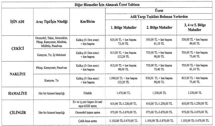 Buna göre, lisanslı yediemin depolarında muhafaza edilen mahcuz malların muhafaza ücreti ile çilingir, çekici ve nakliye hizmetlerine ilişkin bedeller ücret tablosu esas alınarak hesaplanacak. Lisanslı yediemin deposu bulunmayan yerlerde ise muhafaza ücretleri, tabloda yer alan bedellerin yüzde 80’i üzerinden belirlenecek.