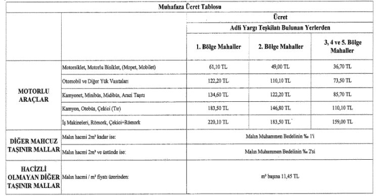 Düzenlemeyle birlikte muhafaza ücretlerine üst sınır da getirildi. Buna göre, muhafaza süresi sonunda hesaplanan ücret, mahcuz malın muhammen bedelinin yüzde 30’unu geçemeyecek. Muhammen bedelin 60 bin TL’yi aşması halinde ise aşan kısım için ücret oranı yüzde 20 ile sınırlandırıldı.