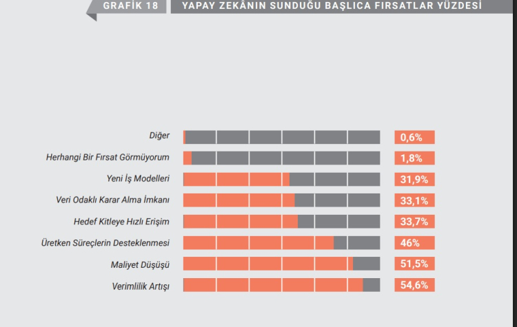 Rapora göre yapay zekâ; verimlilik artışı (yüzde 54,6) ve maliyet avantajı (yüzde 51,5) gibi önemli fırsatlar sunuyor. Ancak bu dönüşüm beraberinde ciddi riskleri de getiriyor. Katılımcıların yüzde 62’si üretkenliğin azalması riskine dikkat çekerken, bilgi güvenliği (yüzde 51,5), insan etkisinin azalması (yüzde 37,4), telif sorunları (yüzde 36,8) ve algoritmik önyargılar (yüzde 30,7) öne çıkan diğer riskler arasında yer aldı.