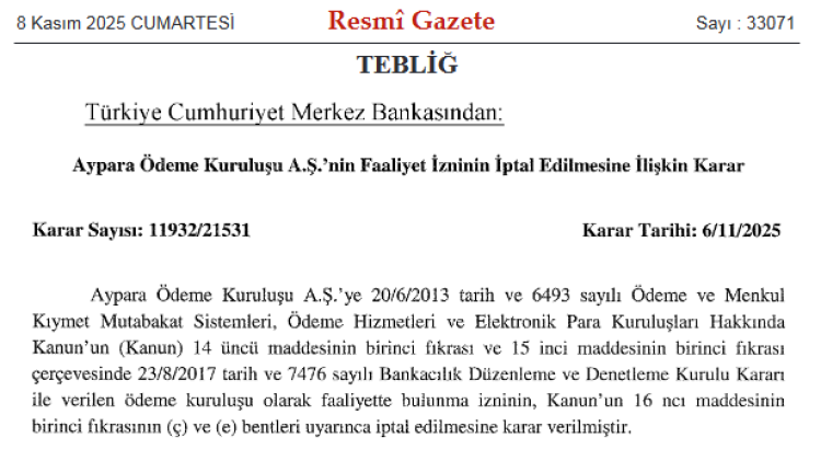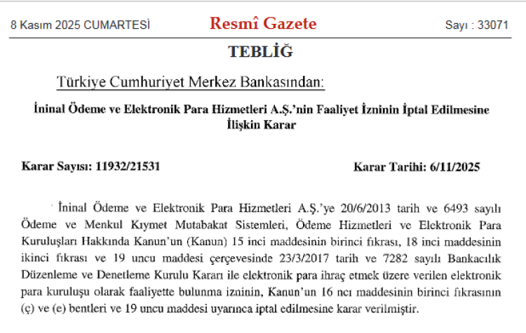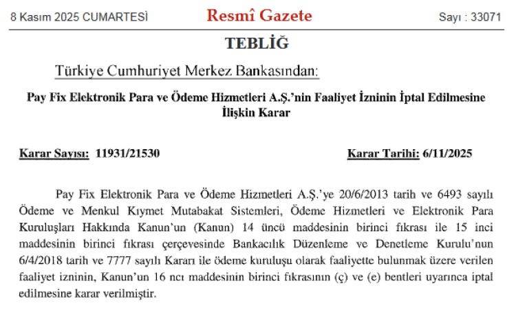 Pay Fix Elektronik Para ve Ödeme Hizmetleri A.Ş., İninal Ödeme ve Elektronik Para Hizmetleri A.Ş. ve Aypara Ödeme Kuruluşu A.Ş.’nin müsaadeleri, 6 Kasım 2025 tarihli 11932/21530 ve 11932/21531 sayılı kararlarla sonlandırıldı.