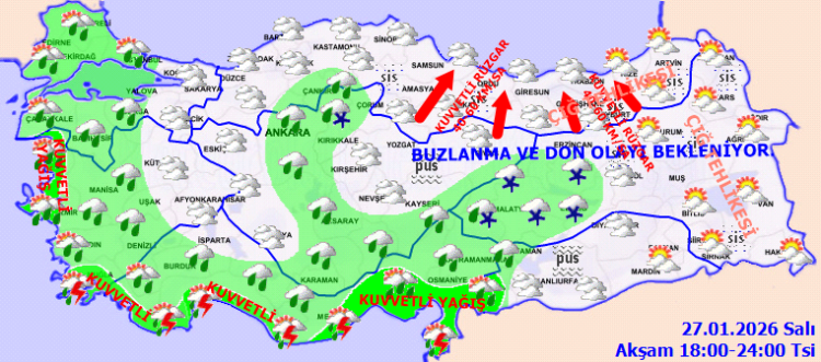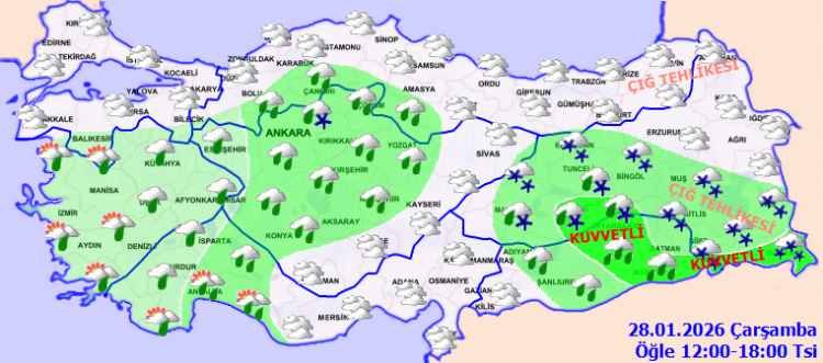 ANKARA (İGFA) – Marmara, Ege, Akdeniz, İç Anadolu ve Güneydoğu Anadolu ile Batı Karadeniz’in batı, Doğu Anadolu’nun güney ve batı kesimlerinin yağışlı geçeceği, genellikle yağmur ve sağanak, yurdun doğu kesimlerinde karla karışık yağmur ve kar şeklinde görülecek yağışların, Ege ve Akdeniz kıyıları, Güneydoğu Anadolu ve Doğu Anadolu’nun güney ve batısında yer yer kuvvetli olacağı tahmin ediliyor. Doğu Karadeniz’in iç kesimlerinin yüksekleri ile Doğu Anadolu’nun doğusunun yüksek kar örtüsüne sahip eğimli kesimlerinde çığ tehlikesi bulunmaktadır.