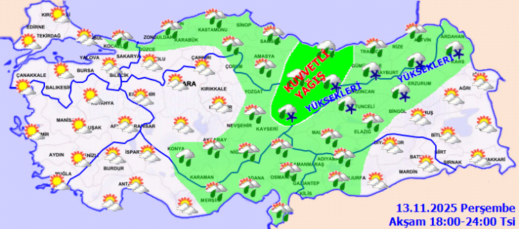 Meteoroloji’nin 13 Kasım Perşembe gününe ait hava kestirim raporuna nazaran, ülke genelinde yağışlı havanın tesirli olması bekleniyor. Birtakım vilayetler için yağışların kuvvetli olabileceği uyarısı yapıldı.