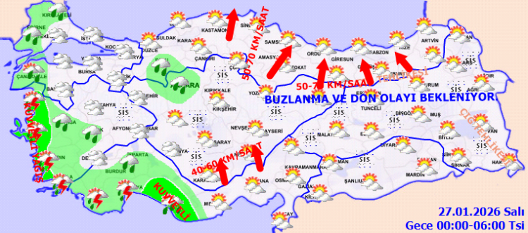 Bugün (26 Ocak Pazartesi) akşam saatlerinden itibaren Samsun, Sinop ve Kastamonu’nun kuzeyi, Tokat’ın kuzey ve doğusu ile Ordu, Giresun ve Trabzon’un iç kesimlerinde güney yönlerden kuvvetli rüzgar ve yer yer fırtına beklenirken, rüzgar hızının yer yer 60-80 km/saat seviyelerine ulaşabileceği bildirildi. Fırtınanın 28 Ocak Çarşamba sabahına kadar etkili olması öngörüldü.
