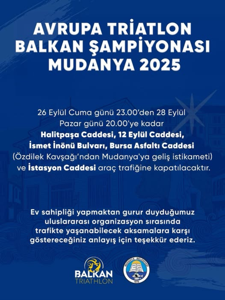 Yüzme, bisiklet ve koşu etaplarıyla Mudanya’nın doğal hoşlukları eşliğinde iki gün sürecek Avrupa Triatlon Balkan Şampiyonası’na mesken sahipliği yapacak Mudanya’nın trafiği ile ilgili de 26-28 Eylül tarihleri kıymetli düzenleme yapıldı. Buna nazaran yarışlar öncesinde 26 Eylül Cuma günü saat 23.00’den 28 Eylül Pazar günü saat 20.00’ye kadar Halitpaşa Caddesi, 12 Eylül Caddesi, İsmet İnönü Bulvarı, Bursa Asfaltı Caddesi (Özdilek Kavşağı’ndan Mudanya’ya geliş istikameti) ve İstasyon Caddesi’nin yarışlar boyunca araç trafiğine kapatılacağı bildirildi.