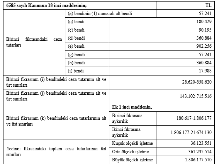 Tebliğle birlikte, 6585 sayılı Kanun’un 18’inci maddesinde yer alan idari para cezaları, 2025 yılı için belirlenen yüzde 25,49’luk yeniden değerleme oranı esas alınarak artırıldı. Yeni ceza tutarları 1 Ocak 2026 – 31 Aralık 2026 tarihleri arasında geçerli olacak.