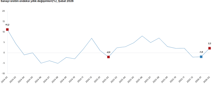 Türkiye’de sanayi üretim endeksi, 2026 yılı Şubat ayında aylık bazda yüzde 2,6, yıllık bazda yüzde 2,2 artış gösterdi.