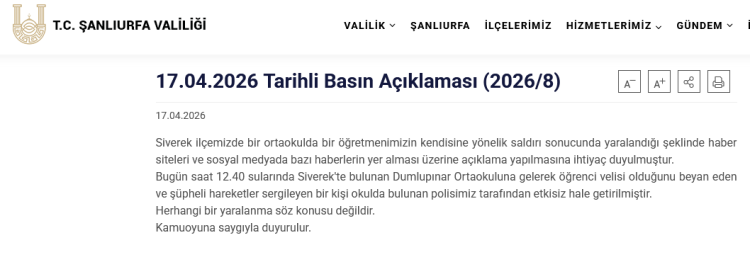 Şanlıurfa Valiliği, Siverek’te bir ortaokulda öğretmene saldırı iddialarını yalanladı: Olayda yaralanan olmadı.