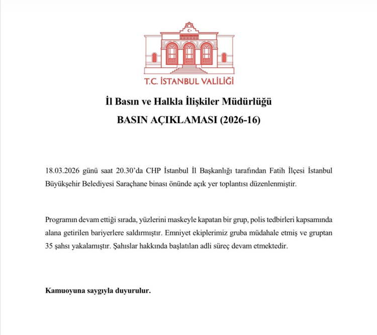 İSTANBUL (İGFA) – İstanbul Valiliği, 18 Mart 2026 günü akşam saatlerinde Cumhuriyet Halk Partisi İstanbul İl Başkanlığı tarafından Fatih ilçesindeki Saraçhane önünde düzenlenen açık hava toplantısında yaşanan olaylara ilişkin açıklama yaptı.