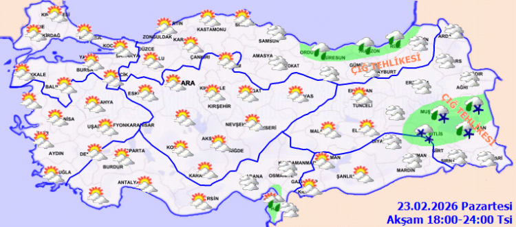ANKARA (İGFA) – Meteoroloji Genel Müdürlüğü, 23 Şubat 2026 Pazartesi gününe ilişkin günlük hava tahmin raporunu yayımladı.