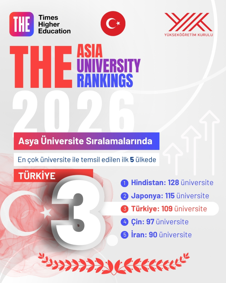 YÖK Başkanı Erol Özvar, Times Higher Education 2026 Asya Üniversiteler Sıralaması’nda Türkiye’nin 109 üniversite ile en çok temsil edilen üçüncü ülke olduğunu açıkladı.