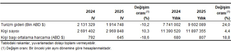IV. çeyrekte turizm gideri yüzde 10,2 azalarak 1 milyar 914 milyon 748 bin dolar olurken, bu dönemde yurt dışını ziyaret eden vatandaş sayısı yüzde 10,3 artış gösterdi.