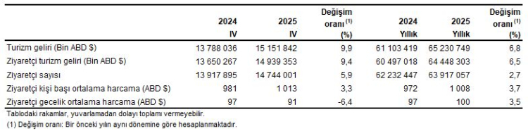 Turizm geliri 2025 yılı IV. çeyreğinde, bir önceki yılın aynı dönemine göre yüzde 9,9 artarak 15 milyar 151 milyon 842 bin dolar olarak gerçekleşti. Bu dönemde ziyaretçilerden elde edilen gelir 14,9 milyar dolar olurken, transfer yolculardan sağlanan gelir 212 milyon dolar oldu. Çeyrek dönem gelirinin yüzde 19,1’i yurt dışı ikametli vatandaşlardan elde edildi.