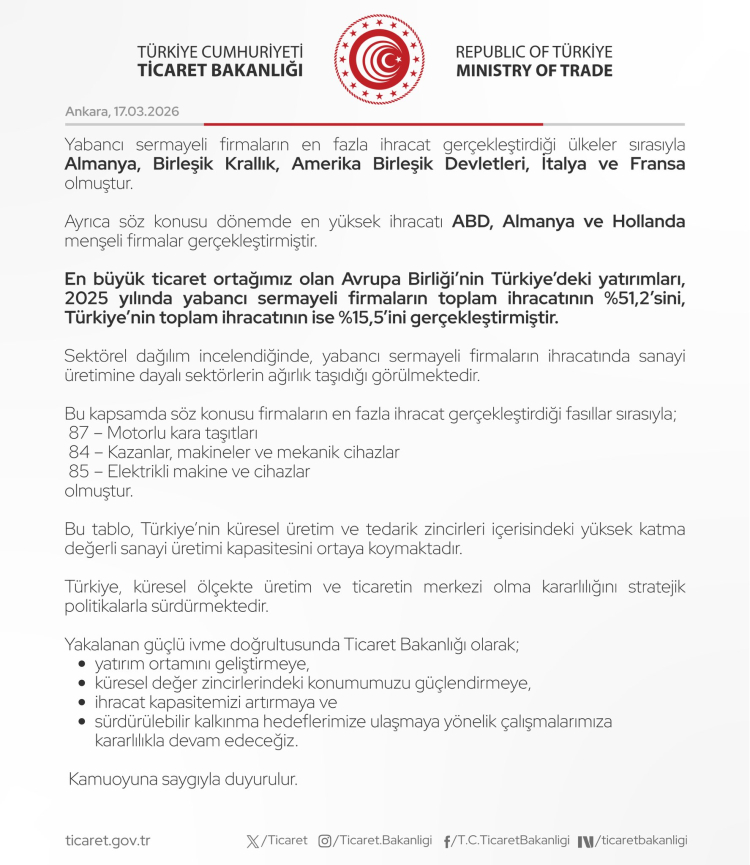Ticaret Bakanlığı, 2025’te Türkiye’ye gelen uluslararası doğrudan yatırımların yüzde 29 arttığını ve yabancı sermayeli firmaların toplam ihracatın yaklaşık yüzde 30’unu gerçekleştirdiğini açıkladı.