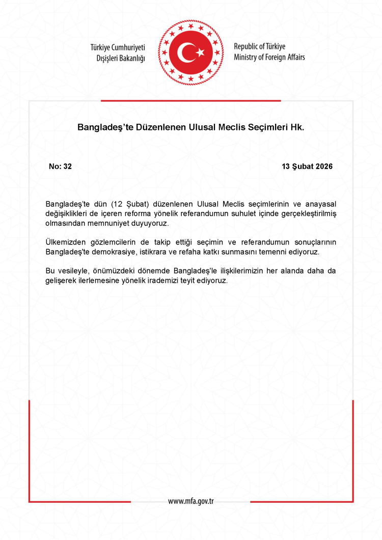 Dışişleri Bakanlığı, Bangladeş’teki seçim ve referandumun huzur içinde gerçekleşmesinden memnuniyet duydu. Türkiye’nin gözlemci olarak katıldığı süreçte, sonuçların demokrasiye katkı sağlaması temenni edildi.