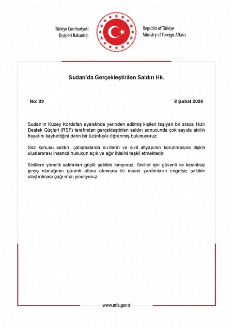 Dışişleri Bakanlığı, Sudan’ın Kuzey Kordofan eyaletinde yerinden edilmiş sivilleri taşıyan bir araca yönelik saldırıyı kınayarak, uluslararası insancıl hukukun açıkça ihlal edildiğini vurguladı.