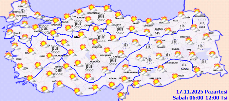 ANKARA (İGFA) – Meteoroloji’nin 17 Kasım Pazartesi gününe ait hava kestirim raporuna nazaran, yurdun genelinde yağış beklenmiyor. Sabah ve gece saatlerinde Trakya, İç Ege, Akdeniz’in iç kesitleri, İç Anadolu’nun güney ve doğusu, Karadeniz’in iç kesitleri, Doğu Anadolu ile Güneydoğu Anadolu’nun kuzeyinde pus ve yer yer sis bekleniyor.