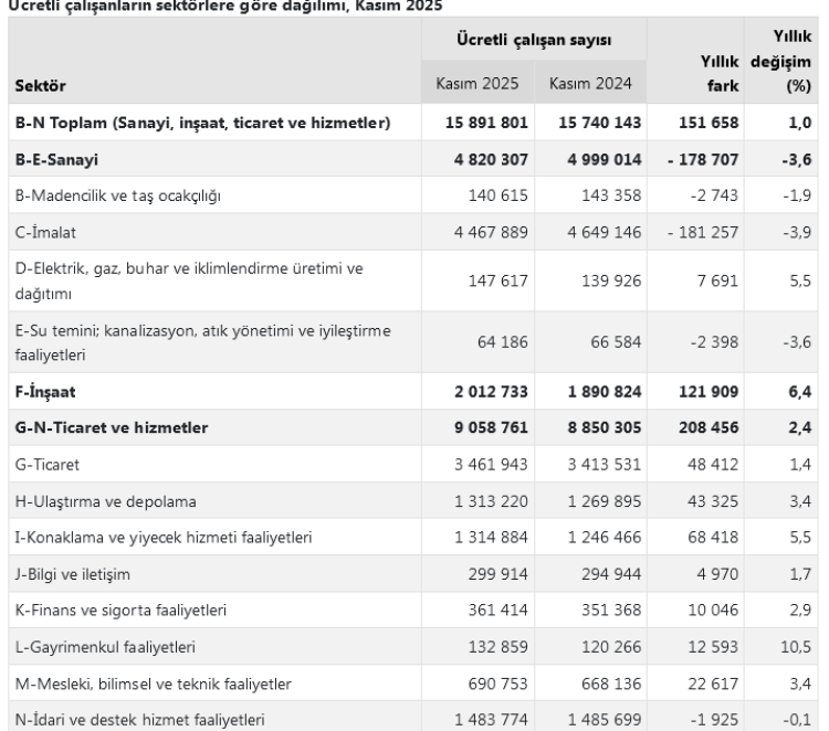 TÜİK verilerine göre, sanayi, inşaat ve ticaret-hizmet sektörlerinde ücretli çalışan sayısı Kasım 2025’te bir önceki yılın aynı ayına göre yüzde 1,0 artarak 15 milyon 891 bine yükseldi. Sektörel bazda ise artış ve azalışlar farklılık gösterdi.