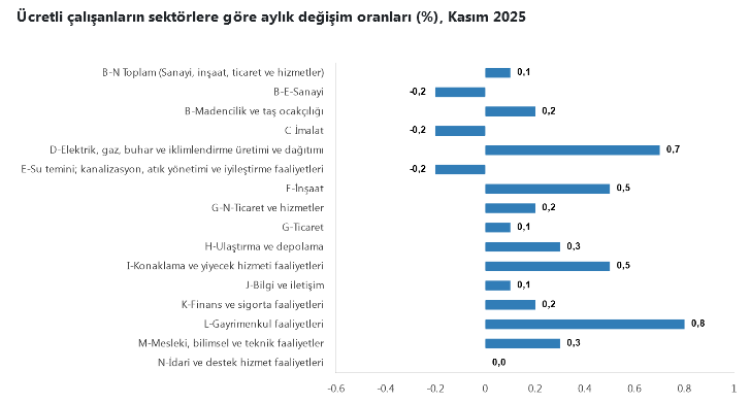 Aylık bazda ise ücretli çalışan sayısı Kasım 2025’te yüzde 0,1 artış gösterdi. Sektörlere göre aylık değişimlerde sanayi sektörü yüzde 0,2 azalış, inşaat sektörü: yüzde 0,5 artış, ticaret-hizmet sektörü yüzde 0,2 artış kaydetti.