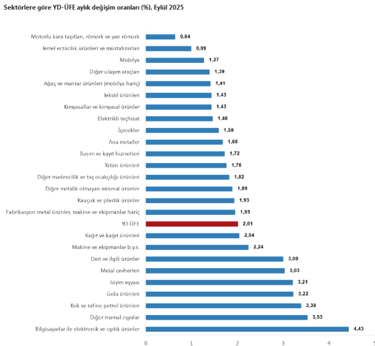 TÜİK Eylül 2025 YD-ÜFE datalarına nazaran, yıllık yüzde 27.71, aylık yüzde 2.01 arttı. İmalat yüzde 27.72, madencilik yüzde 27.06 yükseldi; güç kümesi aylık yüzde 3.39 artışla başkan. Dayanıksız tüketim malları yüzde 33.45 artış gösterdi.
