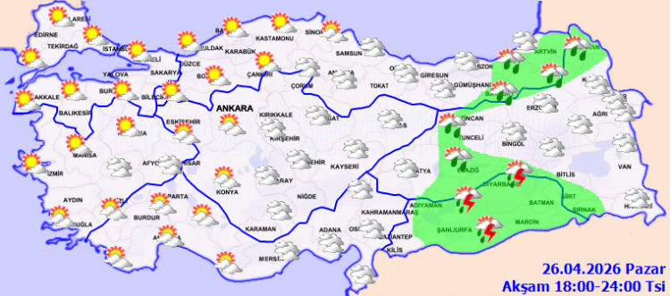 BURSA (İGFA) – Meteoroloji Genel Müdürlüğüİ 26 Nisan Pazar gününe ilişkin hava tahmin raporunu yayımladı.