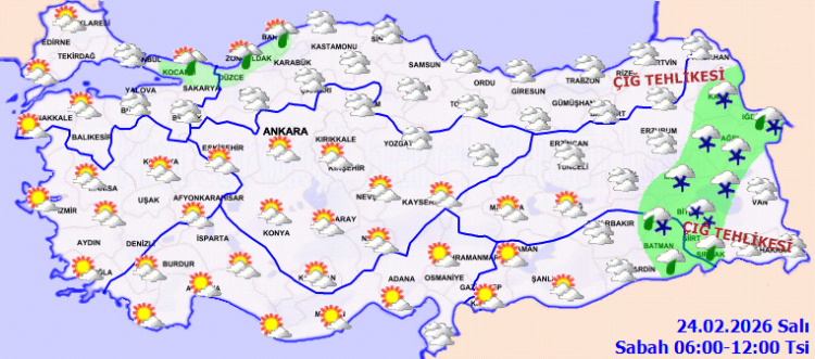 ANKARA (İGFA) – Meteoroloji, 24 Şubat Salı gününe ilişkin hava tahmin raporunu yayımladı. Yapılan son değerlendirmelerine göre Türkiye genelinde parçalı ve yer yer çok bulutlu bir hava hakim olacak. Marmara, Kuzey Ege, İç Anadolu’nun kuzeyi, Batı Karadeniz ile Doğu Anadolu’nun doğusu ve Çorum, Amasya, Batman ile Siirt çevrelerinde yağış bekleniyor.